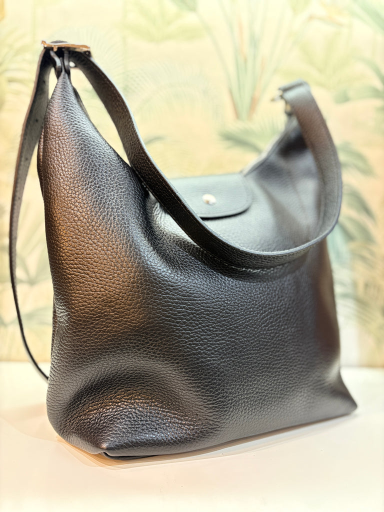 Genuine leather black medium sized handbag with zip and adjustable strap