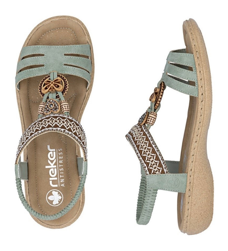 Step into comfort and style with the Rieker Green Beaded Flat Sandal - 61855. Its elastic fastening ensures a perfect fit, while the beautifully beaded upper adds a touch of elegance. Experience all-day comfort with the anti-stress design, making each step feel light and effortless. Perfect for any occasion!
